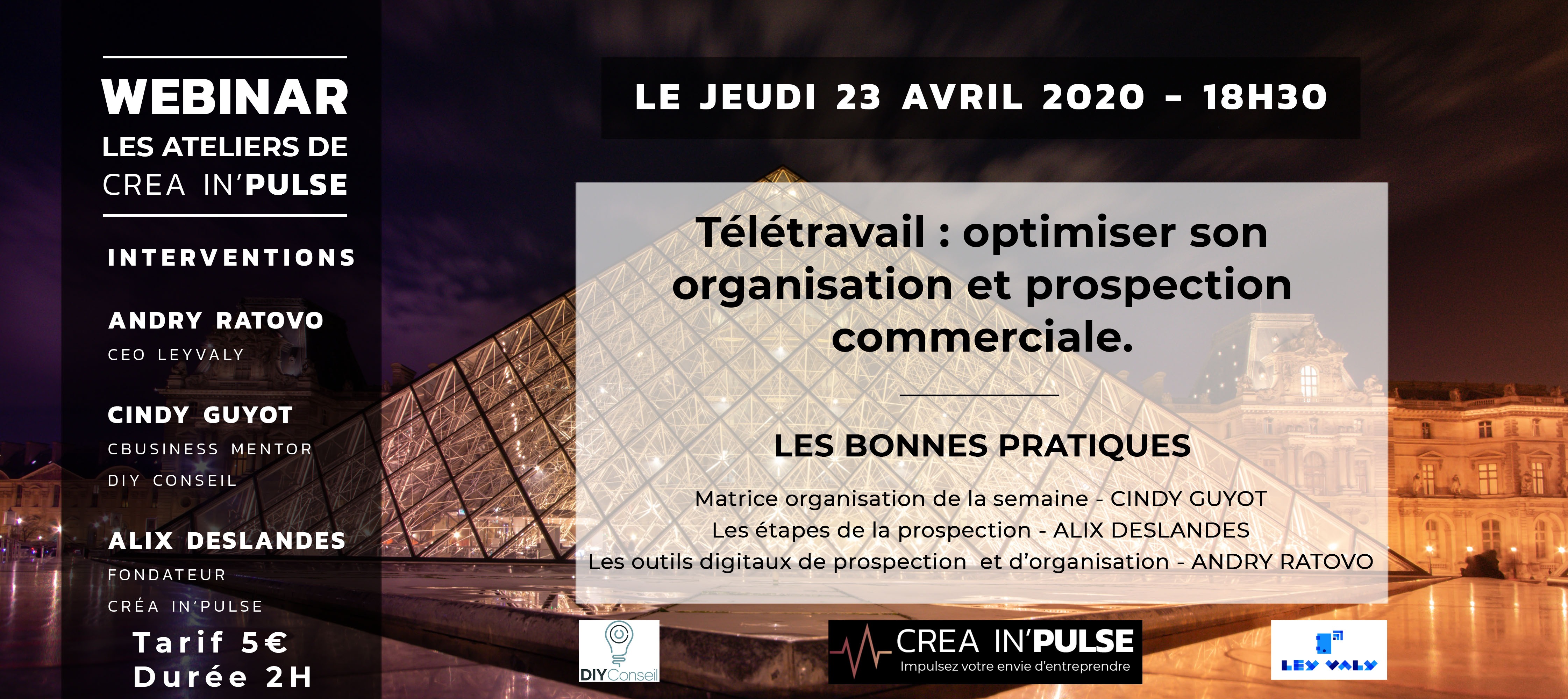 En période de confinement ou simplement en télétravail et au delà du sujet qui sera abordé : "la prospection commerciale", nous évoquerons ensemble comment faire évoluer la prospection commerciale avec les enjeux et contraintes. Nous parlerons de productivité, d'efficacité et d'efficience afin de prospecter dans de bonnes conditions, des étapes clés de la prospection et aussi des outils pour gagner toujours en productivité.